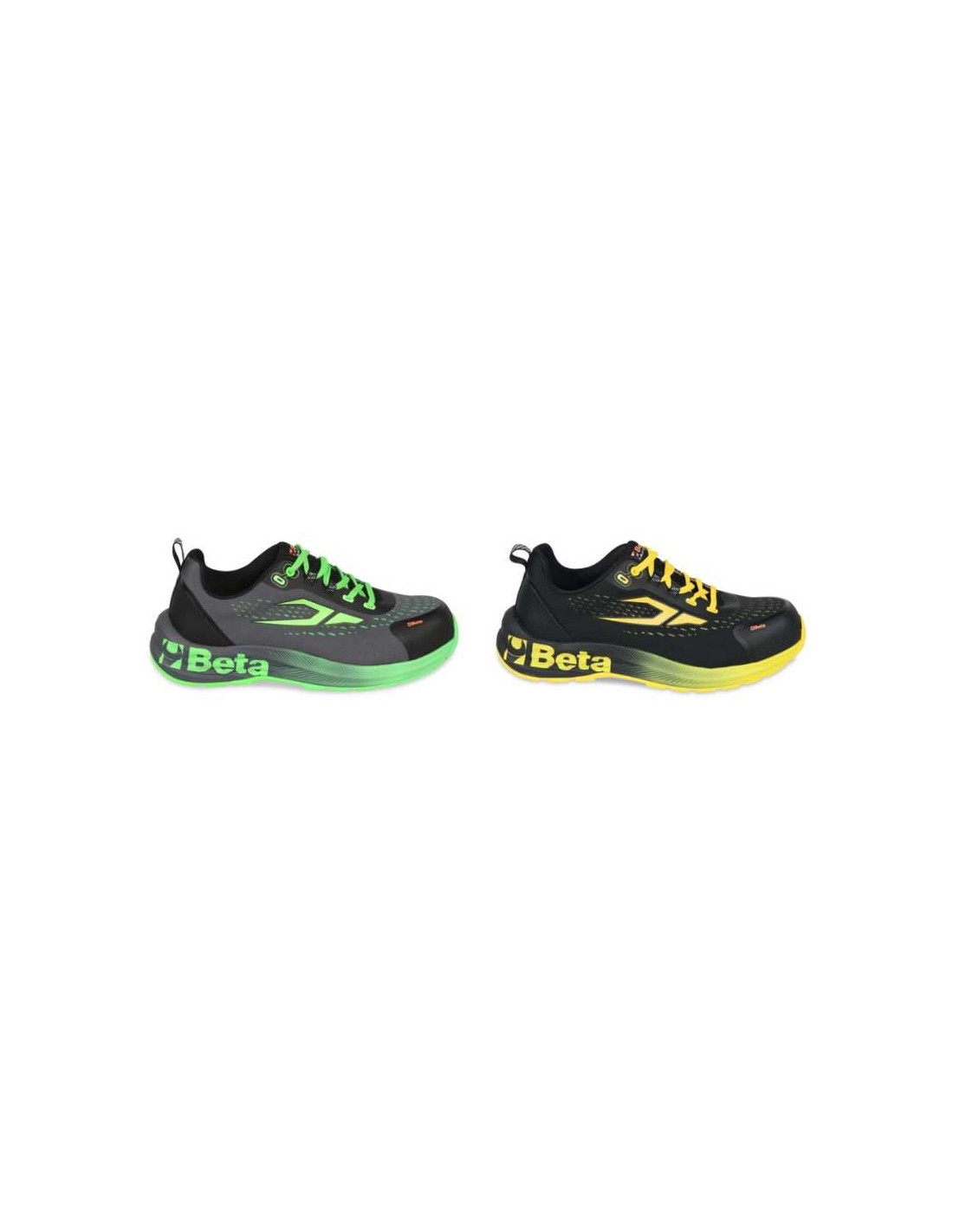 Chaussures de sécurité basses Renegade de Beta, dotées d'une tige en tissu tissé haute respirabilité avec inserts en TPU, support de stabilité au talon, laçage classique avec lacets, semelle avec intercalaire en EVA, semelle extérieure en caoutchouc nitrile haute résistance, embout en matériau polymère, résistance de 200 Joules, protection anti-perforation en fibre composite avec traitement céramique, semelle intérieure en EVA FOAM. Normes : S1PS FO SR HRO.