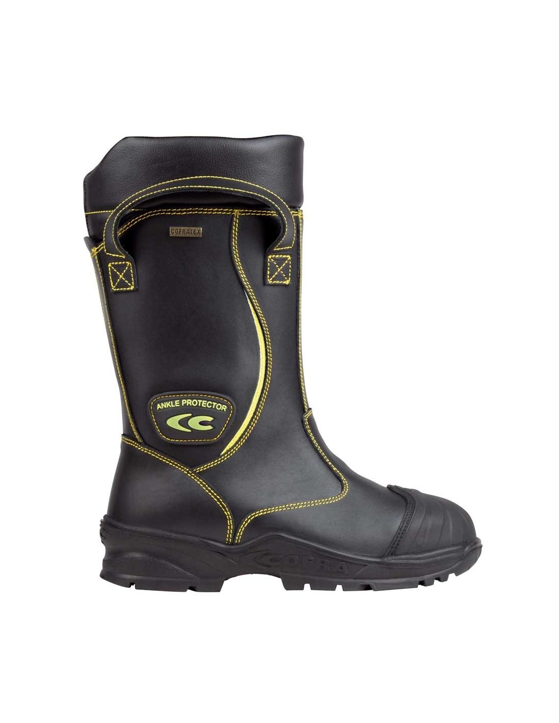 Plus : Bandes latérales pour améliorer la visibilité, chaussures avec protection anti-coupure de tronçonneuse, coutures ignifuges, tirette en cuir, protection de la cheville contre les accidents.
