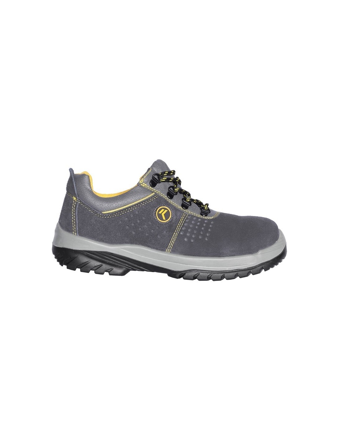 Chaussure basse avec empeigne en daim perforée, semelle en polyuréthane à double densité antidérapante, col rembourré pour un meilleur confort, partie avant sans couture pour réduire le risque de rupture et donc assurer une plus grande robustesse.