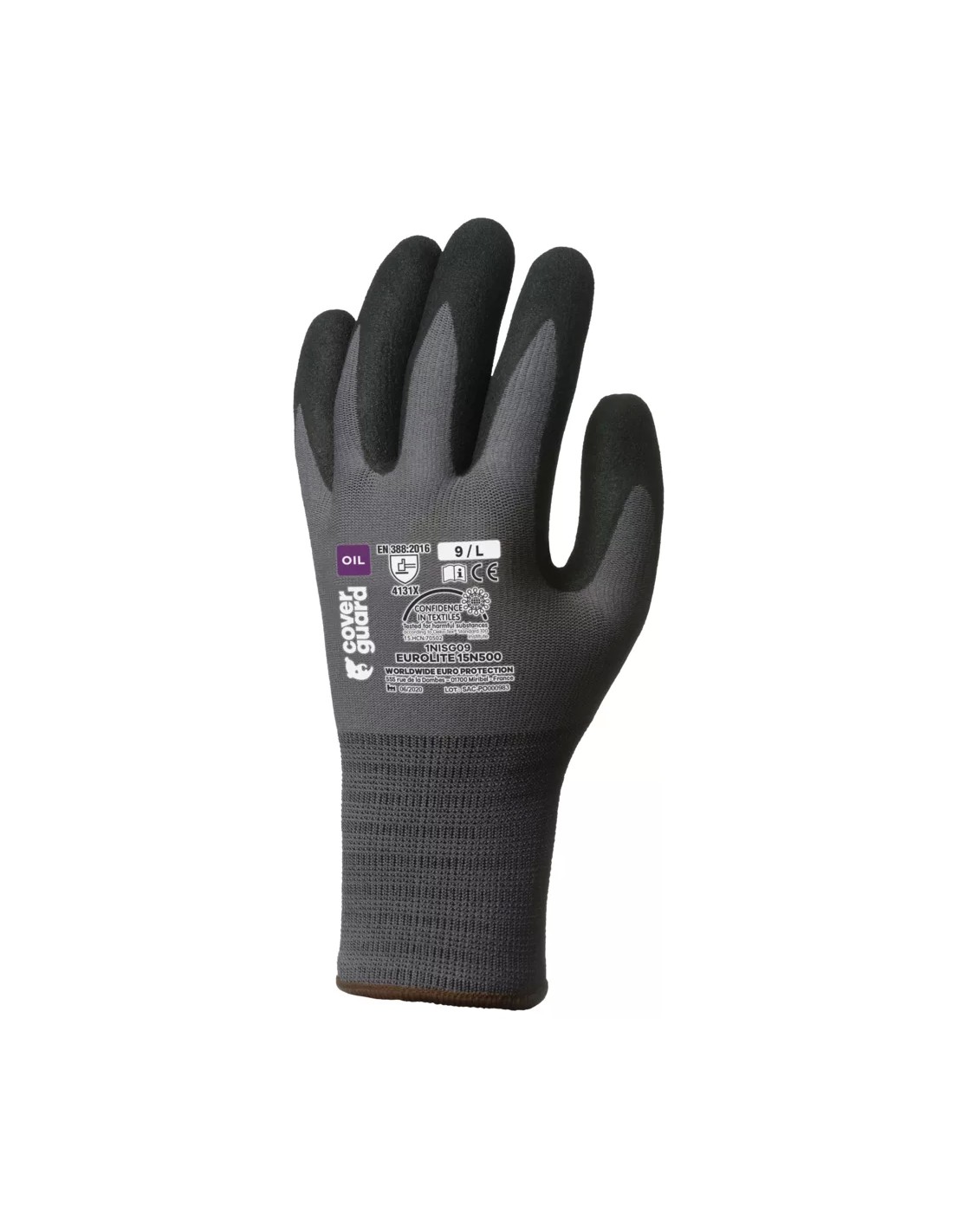 Le gant Eurolite 1NISG de Coverguard est un équipement de protection individuelle de catégorie II conçu spécifiquement pour la maintenance et les travaux de précision en environnements huileux et gras. Sa structure est composée d’un support en tricot gris sans coutures en polyamide et élasthanne, calibre 15, offrant un ajustement ergonomique avec une sensation de seconde peau pour un confort excellent. Le gant se distingue par un double revêtement sur la paume : une base en nitrile lisse noir combinée à une finition effet grain ou « sandy » garantissant une adhérence exceptionnelle même en présence d’huiles, d’hydrocarbures ou de graisses. Complété par un poignet élastique en tricot, le produit est certifié Oeko-Tex Standard 100 pour garantir l’absence de substances nocives et la sécurité au contact de la peau. Ce modèle est conforme aux normes EN420:2003 + A1:2009 et EN388:2016 + A1:2018 avec des niveaux de protection mécanique 4.1.3.1.X, le rendant idéal pour l’industrie légère, la mécanique, l’assemblage de petites pièces, le travail des tôles et le secteur énergétique.