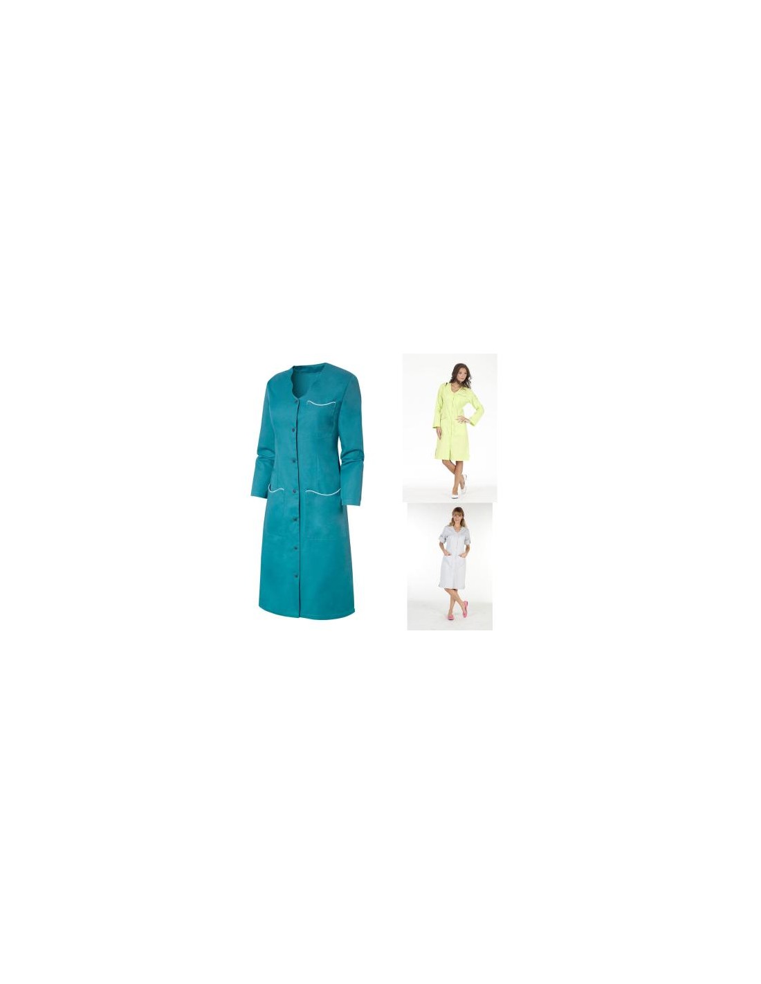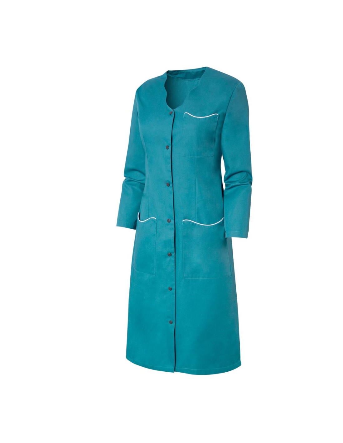 Blouse de travail femme élégante et fonctionnelle, avec encolure fantaisie et détails contrastés qui valorisent les poches et les finitions. Modèle avec fermeture frontale par boutons pression ton sur ton. Dotée d’une poche poitrine et de deux poches basses avec passepoil contrasté, fentes latérales et longueur 105 cm. Réalisée en polyester/coton, résistante et adaptée au lavage industriel, idéale pour différents secteurs professionnels.